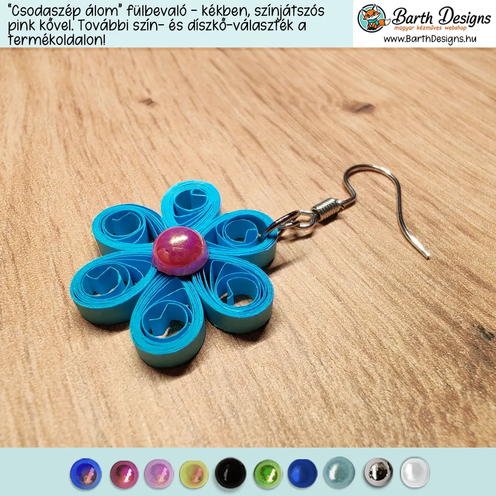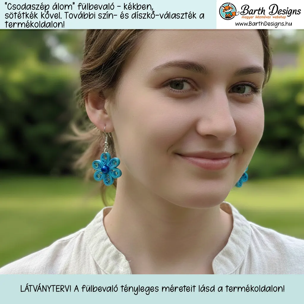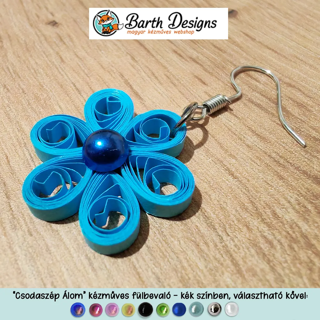 „Csodaszép álom” kék lógós kézműves virágos fülbevaló – választható kővel