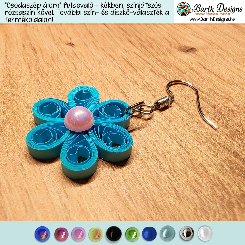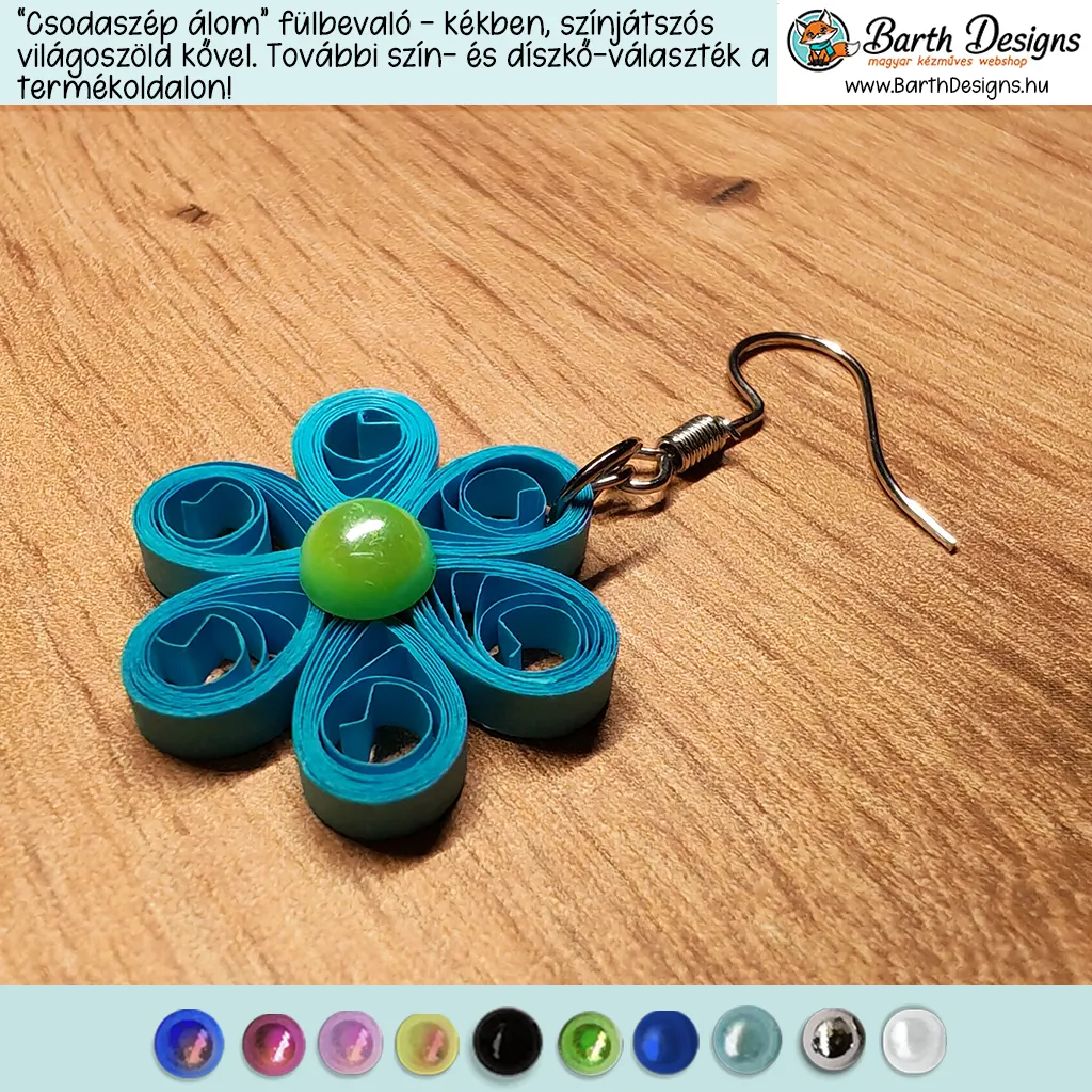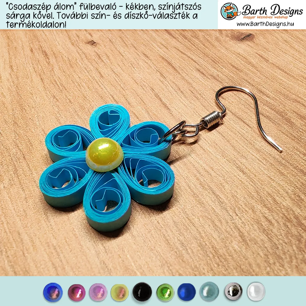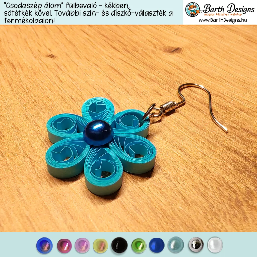 „Csodaszép álom” kék lógós kézműves virágos fülbevaló – választható kővel