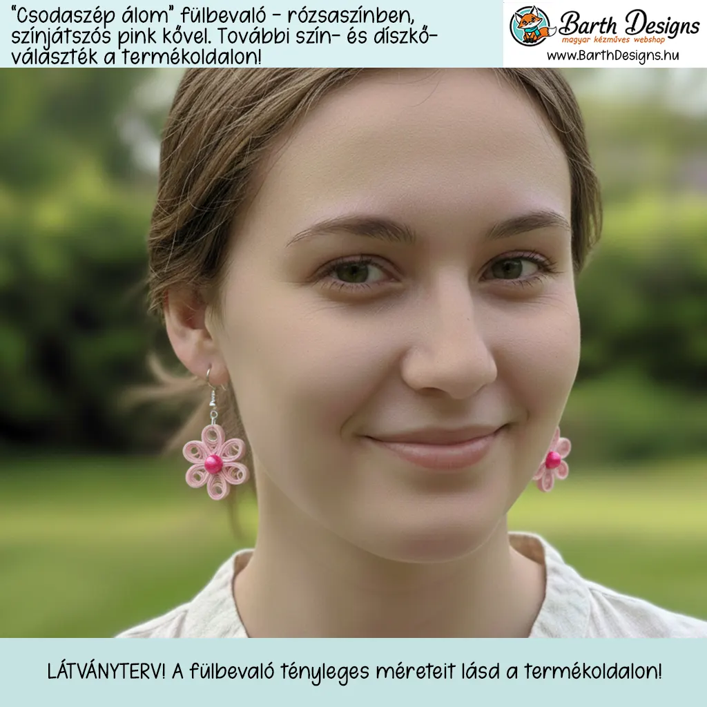 „Csodaszép álom” rózsaszín lógós kézműves virágos fülbevaló – választható kővel