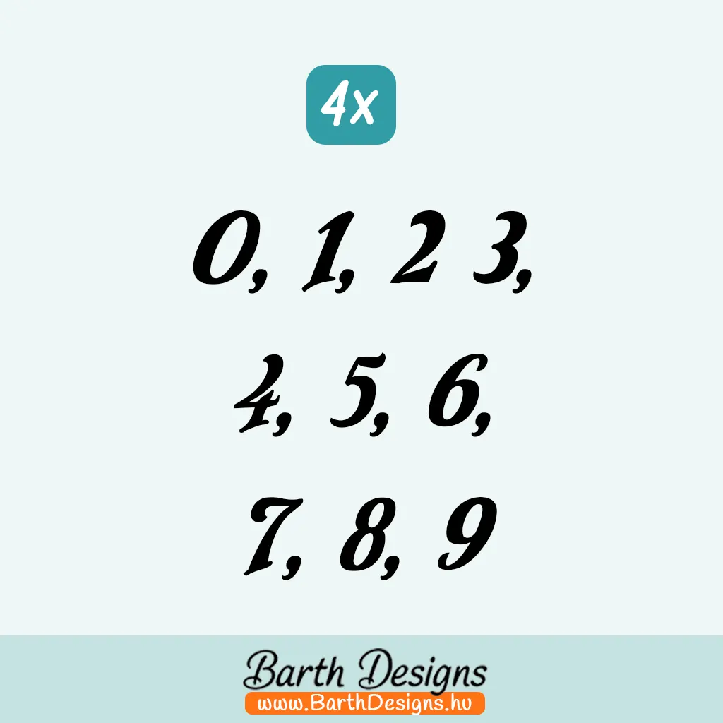 - Írott stílusú szám matricák: 0, 1, 2, 3, 4, 5, 6, 7, 8, 9