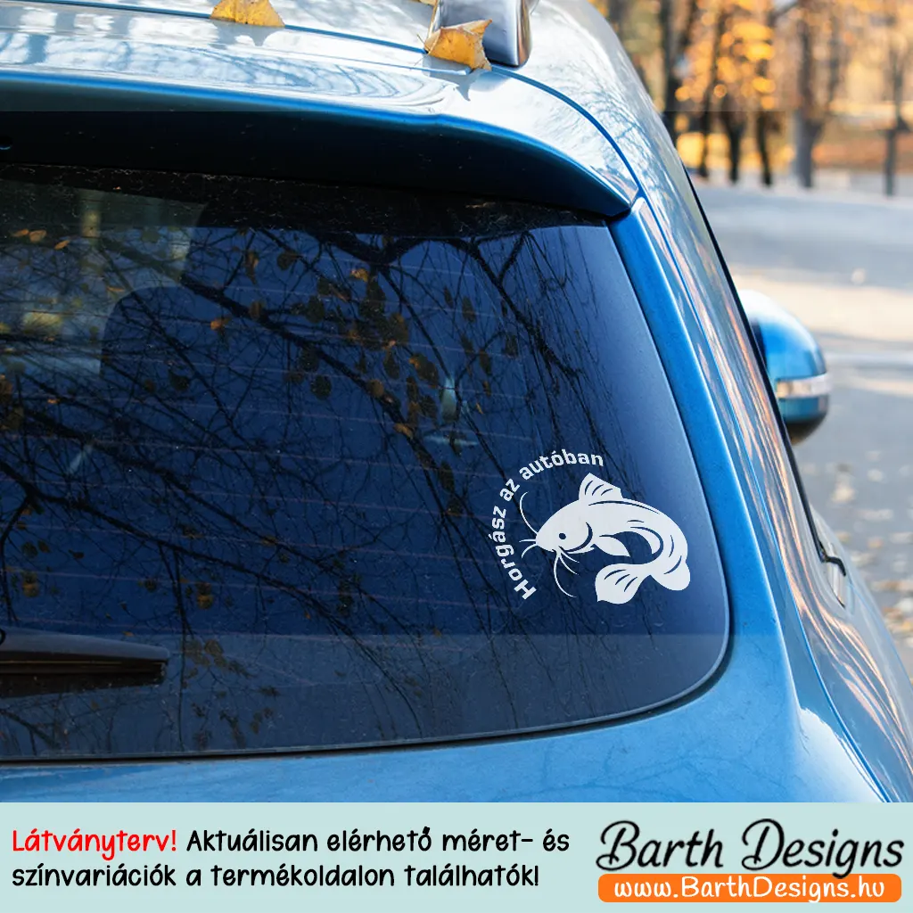 Több variációban harcsa matrica No. 3, horgász az autóban matrica