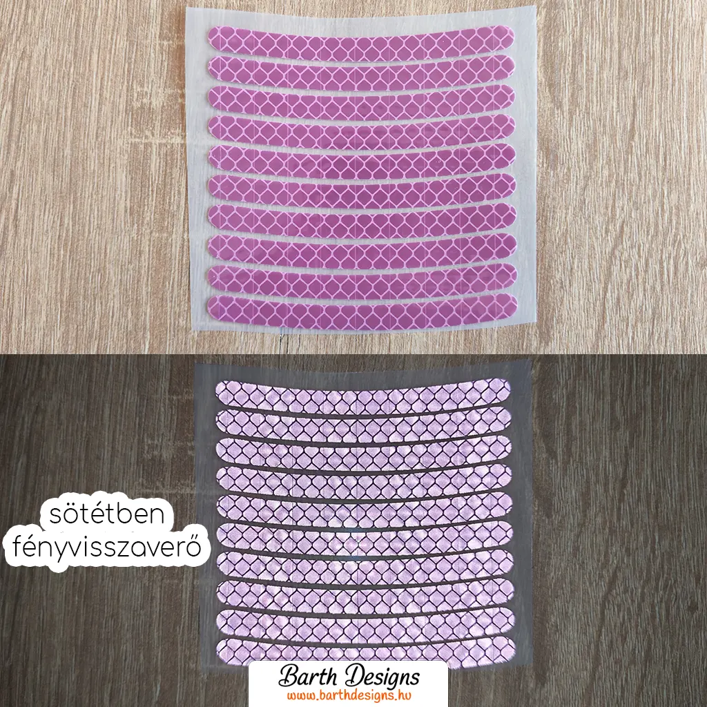 - A szett 10 darab, 0,8 cm szélességű, 9 cm hosszú, enyhén ívelt fényvisszaverő matricát tartalmaz.