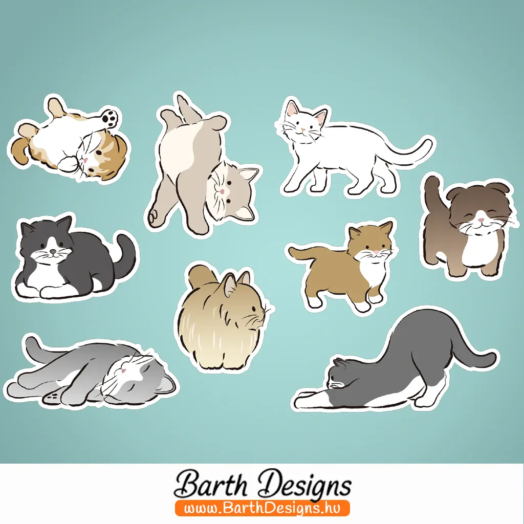 - A szett tartalma 1 db kb. 12 cm x 19 cm-es matricaív, rajta nyomtatott, fehér hátterű, víz- és UV-álló cicás matricákkal (lásd képek)