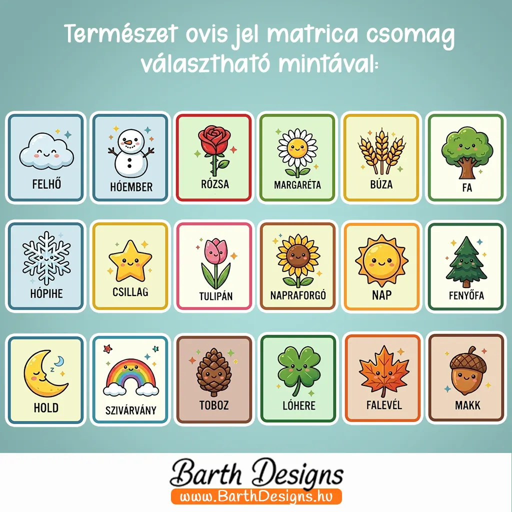 Böngészd át a listát, válaszd ki gyermeked ovis jelét és rendelj matrica csomagot! Ha esetleg nem találnál olyan természet-jelet, amire szükséged lenne, üzenj bátran és bővítjük a listát!