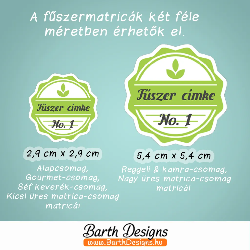Mérete: Az Alapcsomagban, Gourmet-csomagban, Séf keverék-csomagban és a Kis méretű üres fűszermatrica-csomagban lévő matricák mérete 2,9 cm x 2,9 cm.