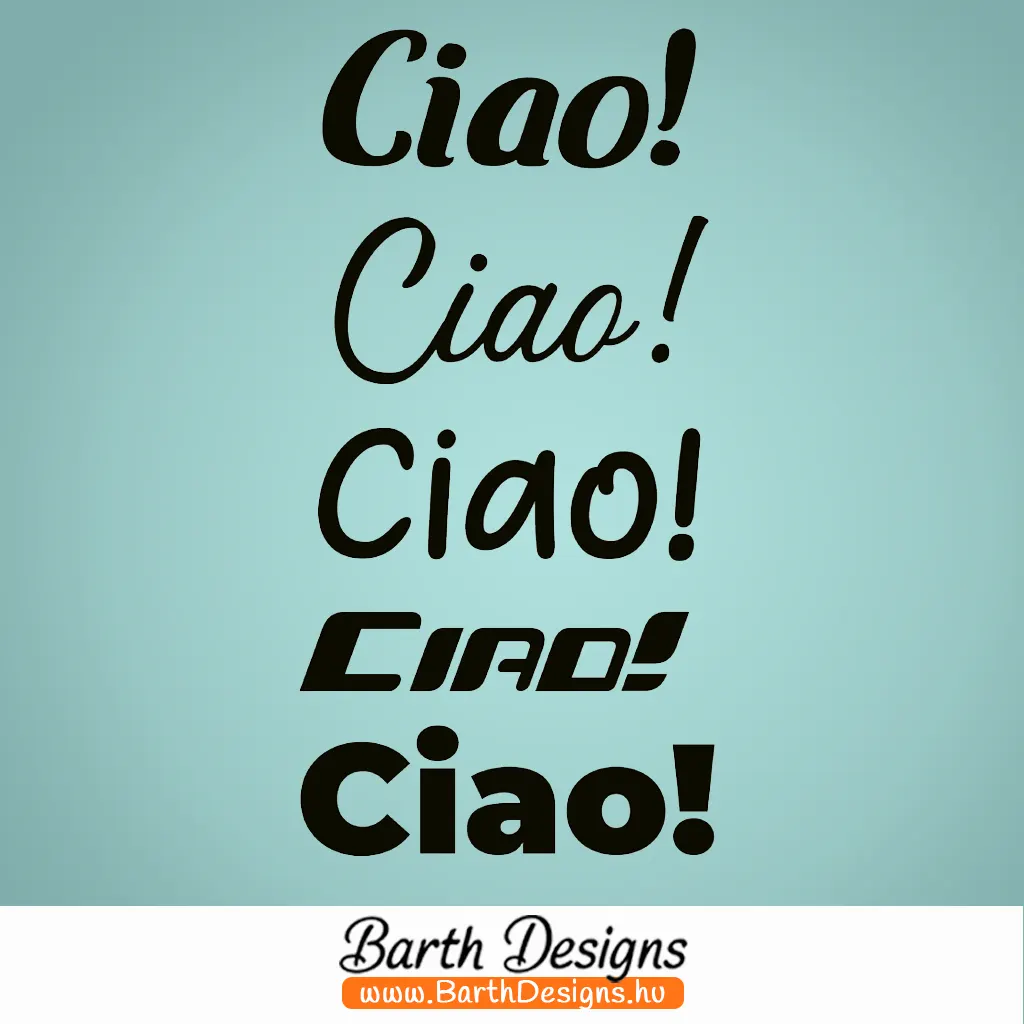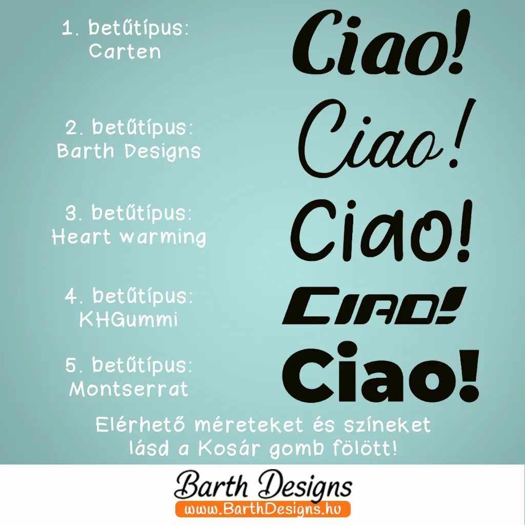 - 5 féle betűtípusban: 1) Carten, 2) Barth Designs, 3) Heart warming, 4) KHGummi, 5) Montserrat