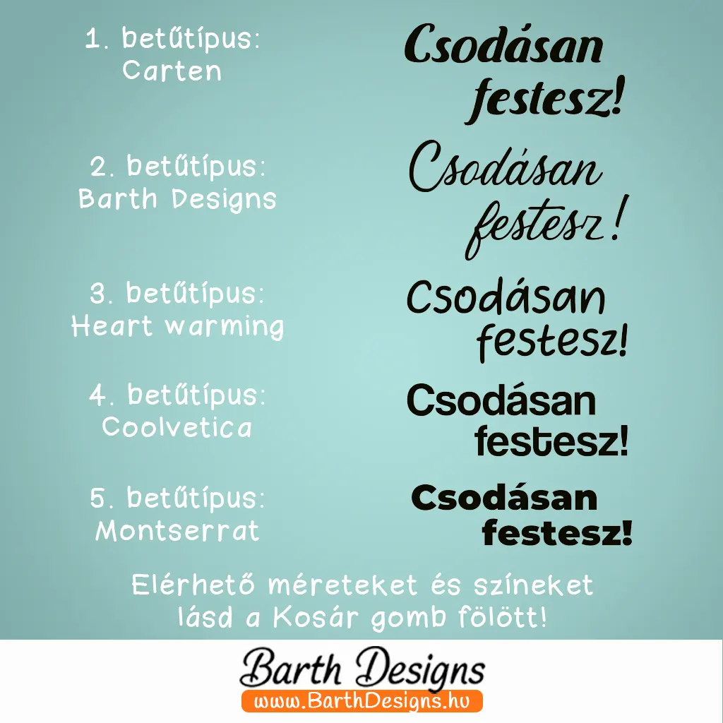 - 5 féle betűtípusban: 1) Carten, 2) Barth Designs, 3) Heart warming, 4) Coolvetica, 5) Montserrat