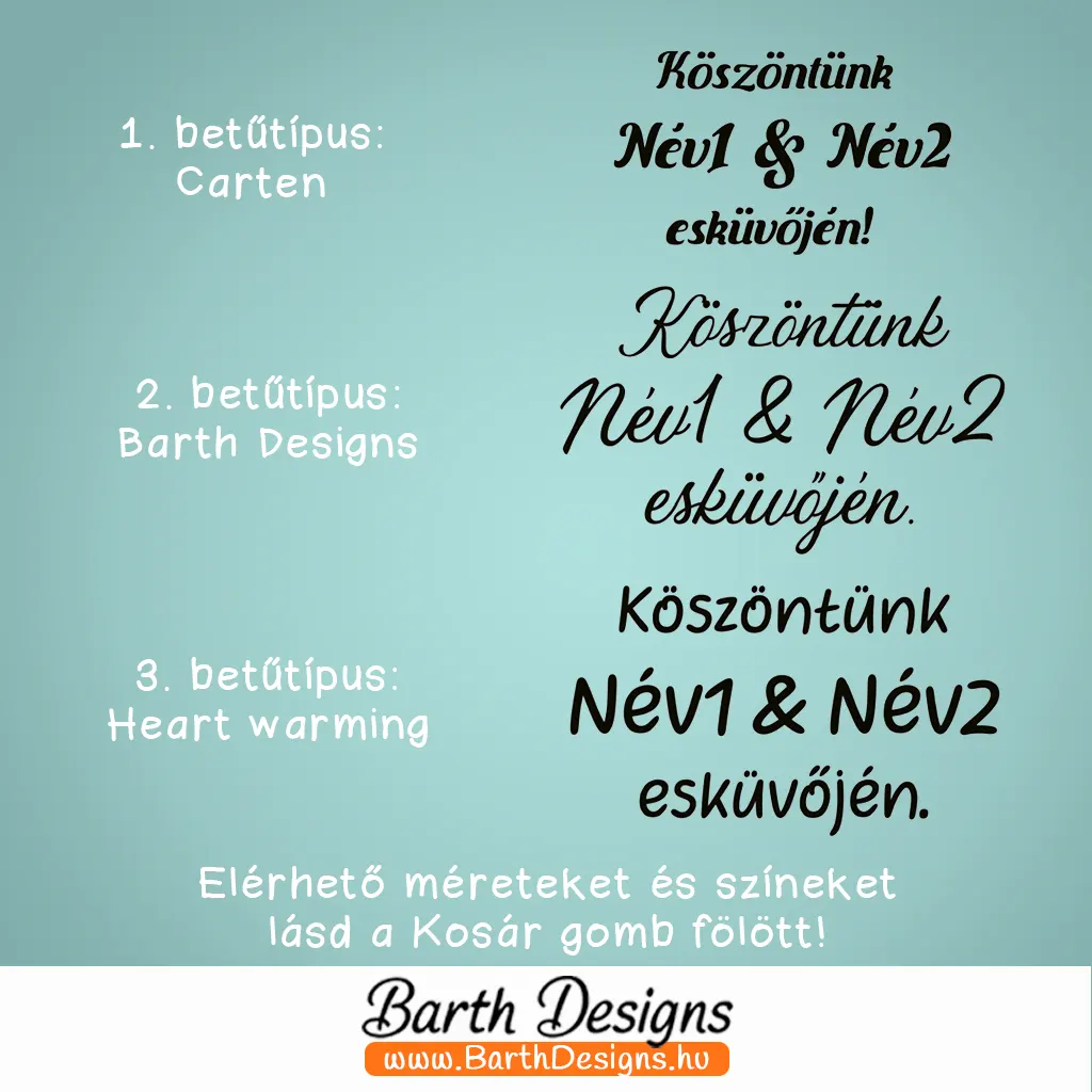 - 3 féle betűtípusban: 1) Carten, 2) Barth Designs, 3) Heart warming