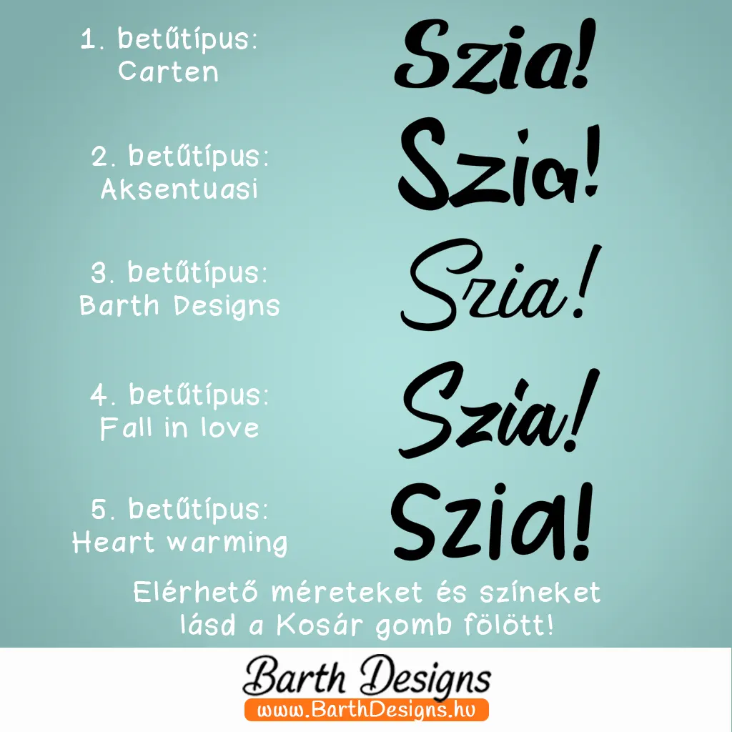 - 5 féle betűtípusban: 1) Carten, 2) Aksentuasi, 3) Barth Designs, 4) Fall in love, 5) Heart warming